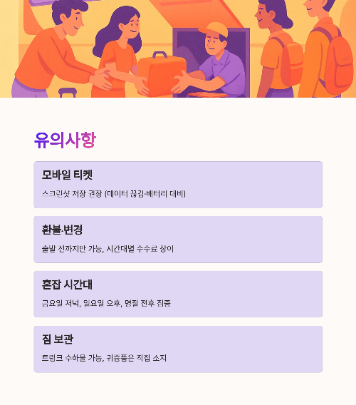 | 모바일 티켓 | 스크린샷 저장 권장 (데이터 끊김·배터리 대비) |