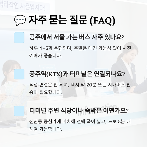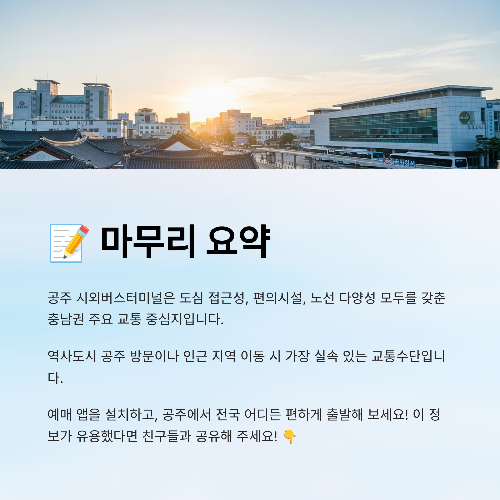 - 🚉 KTX 공주역 ↔ 터미널: 택시 약 20분 / 시내버스 연계 필요