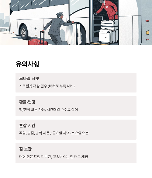 | 짐 보관 | 대형 짐은 트렁크 보관 / 내부 보관함 없음 / 고속버스는 짐 태그 제공 |