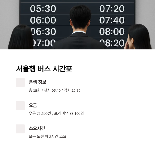 | 서울 (남부터미널) | 약 3시간 | 우등·일반 혼합 운행 / 배차 많고 시간대 고르게 분포됨 |