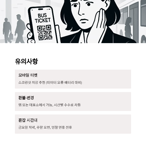 | 모바일 티켓 | 스크린샷 저장 추천 (데이터 오류·배터리 대비) |