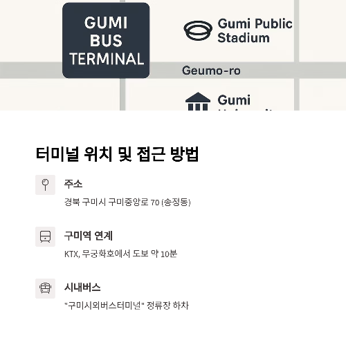 - 🚉 구미역(KTX, 무궁화호) ↔ 터미널: 도보 약 10분