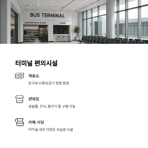 | 편의점 | 터미널 내 입점 / 생필품, 간식, 충전기 등 구매 가능 |