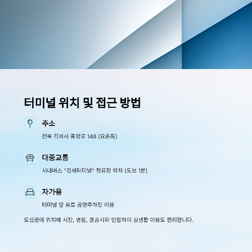 - 🚌 시내버스: “김제터미널” 정류장 하차 (도보 1분 이내)