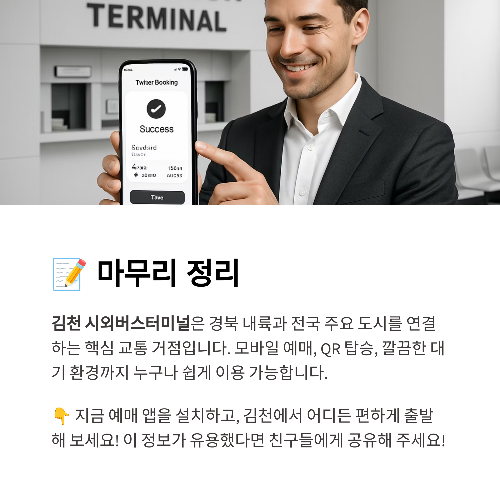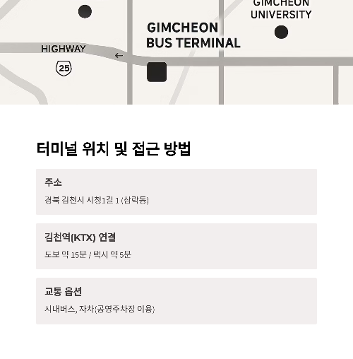 - 🚉 김천역(KTX) ↔ 터미널: 도보 약 15분 / 택시 약 5분