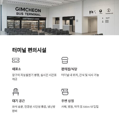 | 편의점 | 터미널 내 또는 인근 위치 / 간단한 간식 및 생필품 구비 |