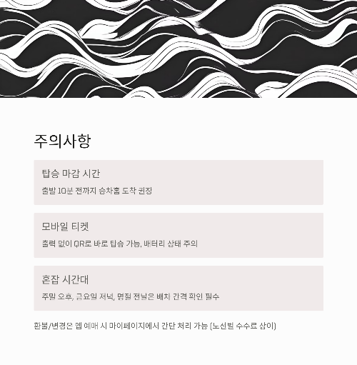 | 모바일 티켓 | 출력 없이 QR로 바로 탑승 가능 / 배터리 상태 주의 |