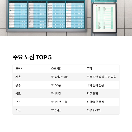 | 대전 | 약 3시간 | 중부권 노선 / 하루 2~3회 / 우등 좌석 선호도 높음 |