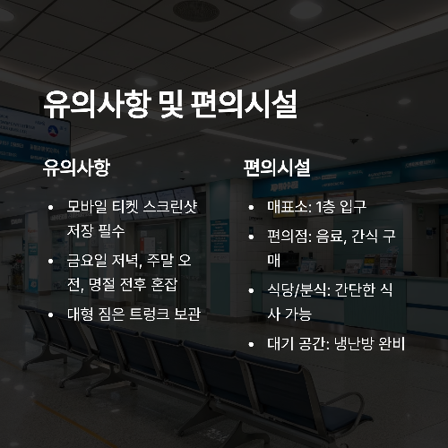 | 편의점 | 터미널 인근 위치 / 음료, 간식, 충전기 등 구매 가능 |