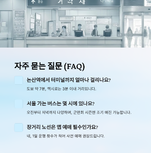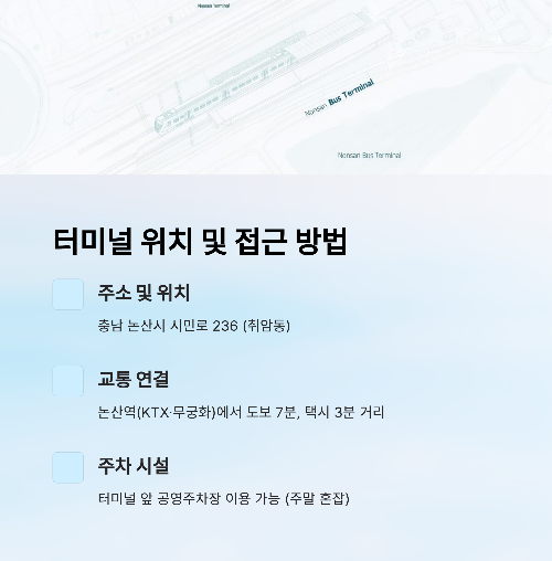 - 🚉 논산역(KTX·무궁화) ↔ 터미널: 도보 약 7분 / 택시 3분