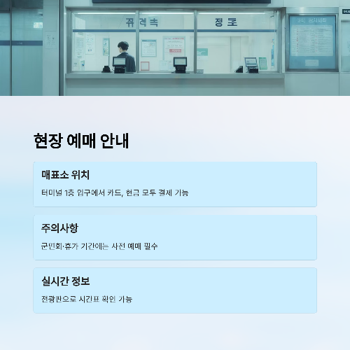 | 서울 (남부터미널) | 약 2시간 30분 | 우등·일반 혼합 / 면회객 많음 / 주말 혼잡 / 예약 필수 |