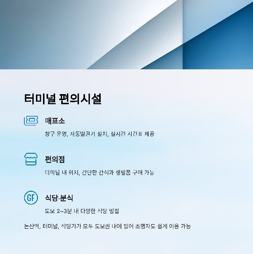 | 편의점 | 터미널 내 또는 바로 인근 위치 / 간단한 간식과 생필품 구매 가능 |