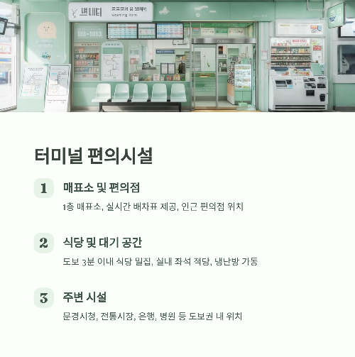 | 매표소 | 터미널 입구 1층 / 카드·현금 결제 가능 / 실시간 배차표 제공 |