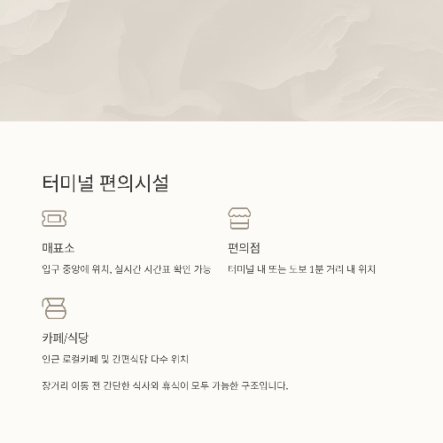 | 편의점 | 터미널 내 또는 도보 1분 거리 내 위치 / 간식·음료 구매 가능 |
