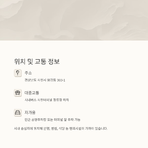 - 🚕 택시: 사천 IC 또는 진주혁신도시에서 약 20~25분 거리