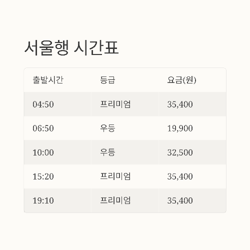 | 출발시간 | 도착예정 | 등 급 | 요 금(원) | 소요시간 |