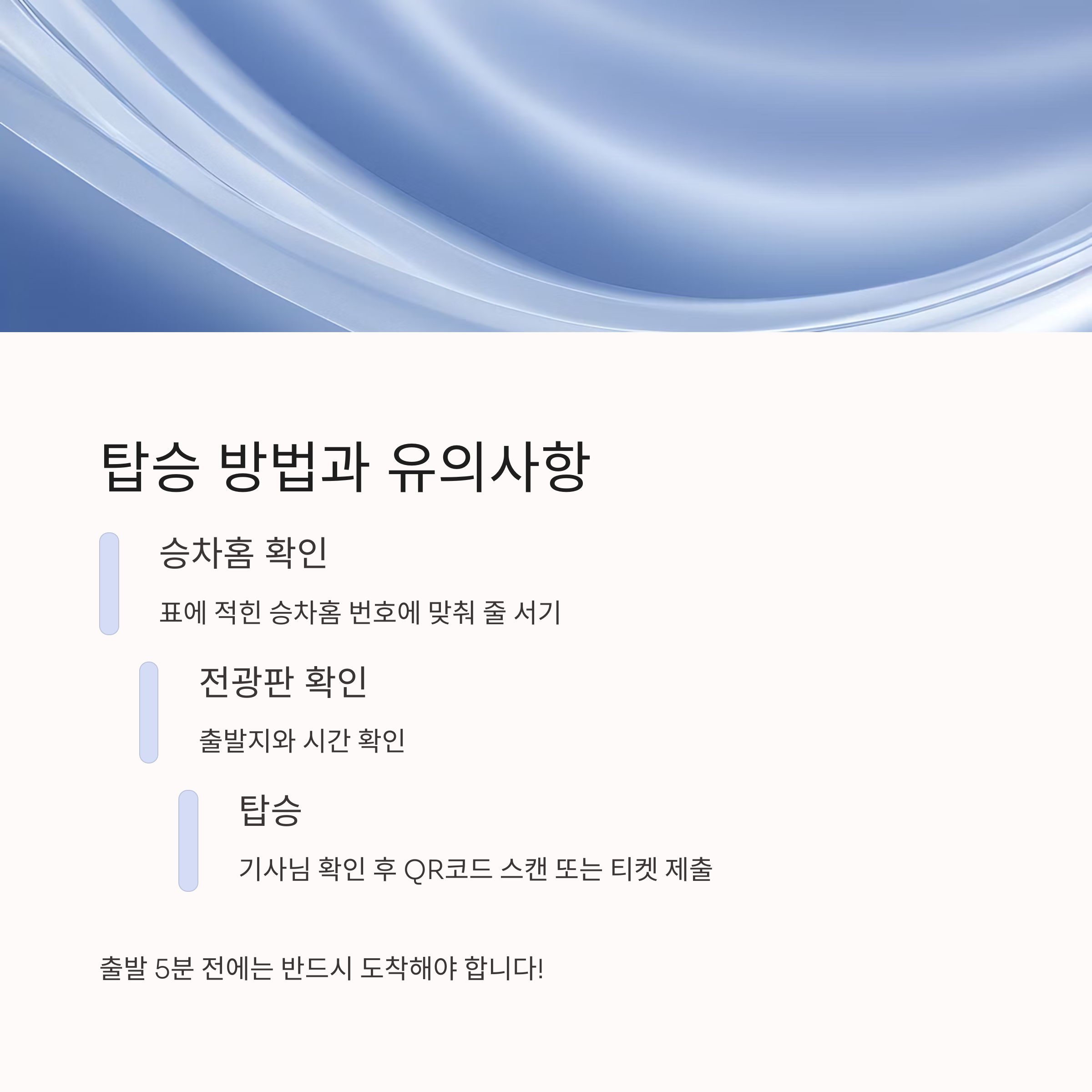 - 기사님 확인 후 바로 탑승 (QR코드 스캔 or 티켓 제출)