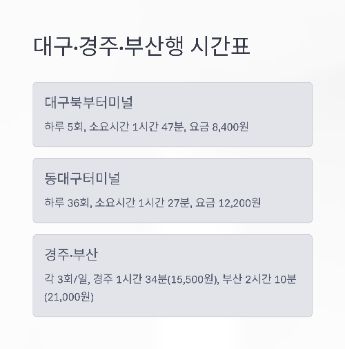 | 대구 (북부,동대구) | 약 1시간 10분 | 경북권 이동 / 생활권 이동객 많음 / 자주 운행됨 |