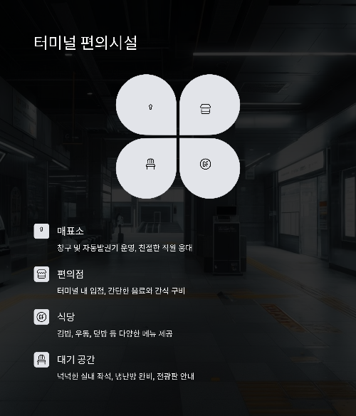 - 🚗 자가용: 터미널 전용 주차장 및 인근 유료 주차장 운영
