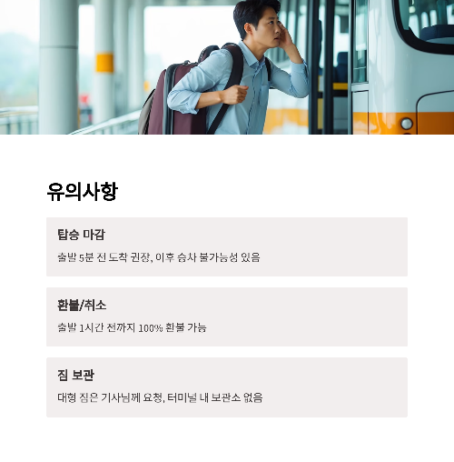 | 짐 보관 여부 | 대형 짐은 기사님께 직접 요청 / 터미널 내 보관소 없음 |